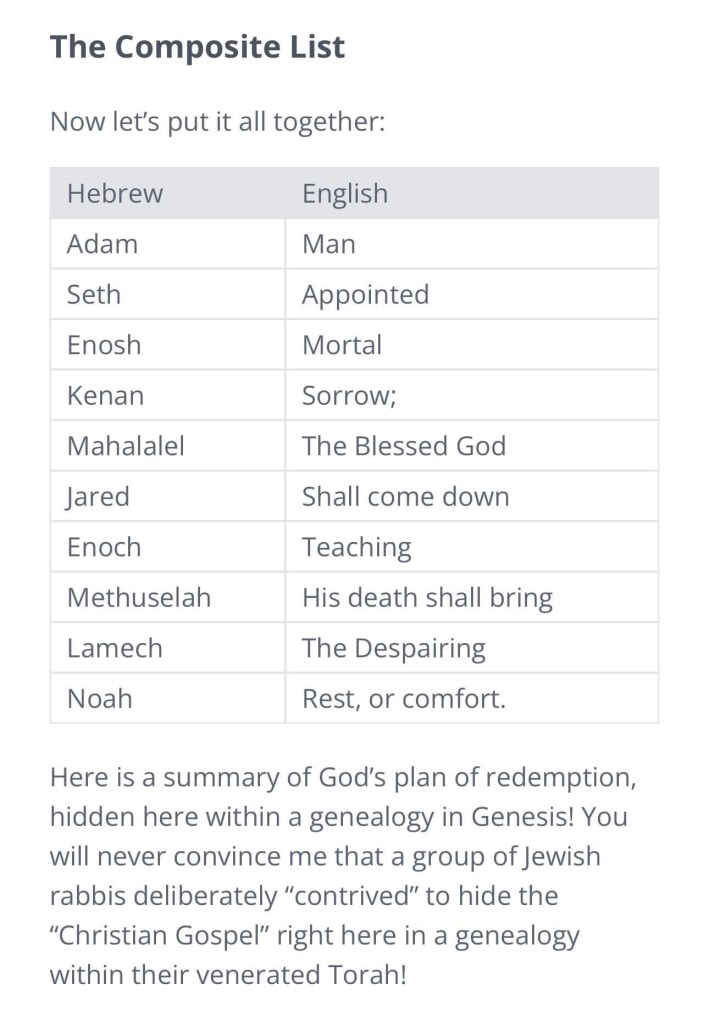 Perhaps you have seen the post that claims the names of the genealogies in Genesis 5 conceal a secret message. The one I saw today had the following chart to illustrate this message. Basically, if you take the leading name of the men from Adam to Noah (Gen 5) you get the hidden message in the chart below: Man Appointed Mortal Sorrow; The Bless God Shall Come Down Teaching; His Death Shall Bring the Despairing Rest, or Comfort. The awkward grammar should be your first clue that someone is making this up.